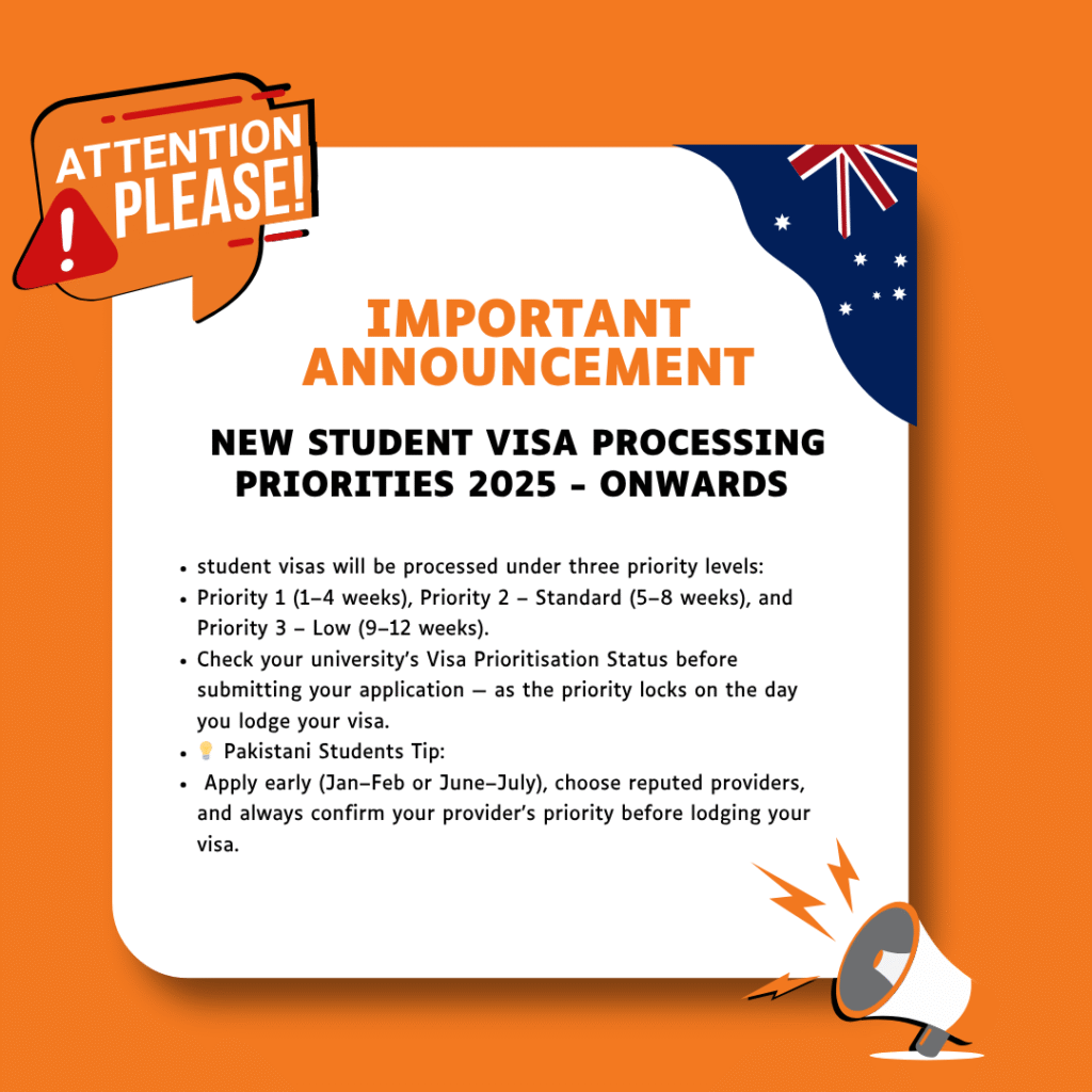 Starting in 2025, Australian student visa applications will follow three priority levels: Priority 1 (1–4 weeks), Priority 2 (5–8 weeks), and Priority 3 (9–12 weeks). Applicants should verify their university’s Visa Prioritisation Status before submission, as the priority locks on the day of lodgement. Pakistani students are advised to apply early (Jan–Feb or June–July), choose reputed education providers, and confirm their provider’s priority for faster student visa processing.